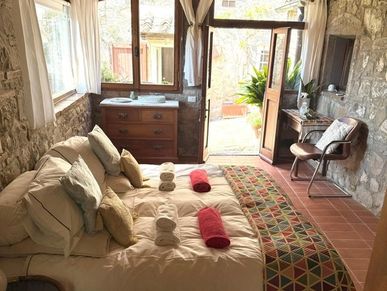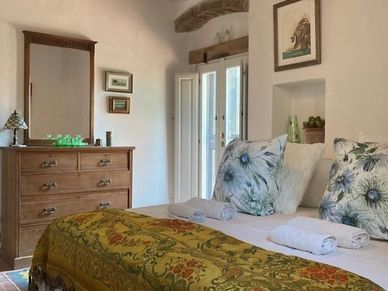 A Tuscan and retro styled suite with a super king size or twin beds, overlooking a garden with irises, roses, cypress and olive trees