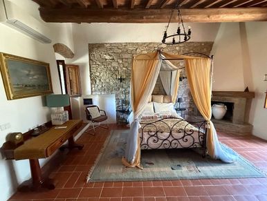 A Fairytale four poster suite with double doors overlooking the garden, pool and Chianti Hills